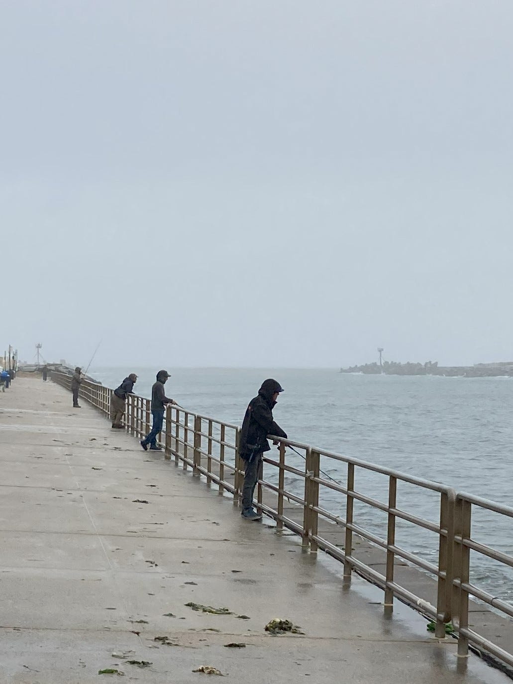 The ocean was mean, and the water grey. A fine rain fell on the foul weather geared fisherman that were spread out on the groin and along the shallows. I did what I could to appear present, but I said nothing.